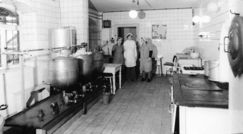 Die Küche des Heimes wurde in den 60er Jahren weiter verbessert und modernisiert. 1961/62 belegte man Fußboden mit Steinzeugfliesen, z.T. auch in NAW-Arbeit. Die Küchenwände wurden mit Kacheln bis zur Decke hoch gefliest. Der alte Elektroherd und weitere Geräte wurden durch einen damals moderneren Gasherd sowie Kohleherd ersetzt. Als weitere Verbesserung verlegte man in der Küche die Heißwasserleitung direkt bis zum Spülbecken. Für die dort beschäftigten Arbeitskräfte konnten so wesentliche Arbeitserleichterungen geschaffen werden.