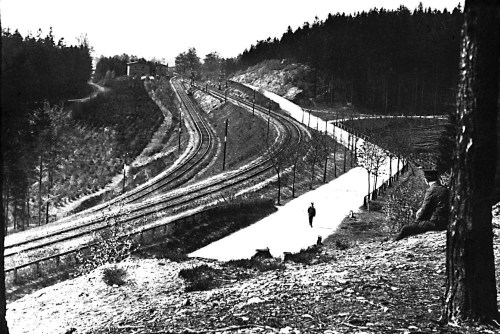 Abzweig am Schützenhaus ca. 1910 (rechts: Strecke nach Limbach, links: Strecke nach Chemnitz, Quelle: Buch Grüna/Sa. Geschichte und Geschichten aus der Grünen Au)