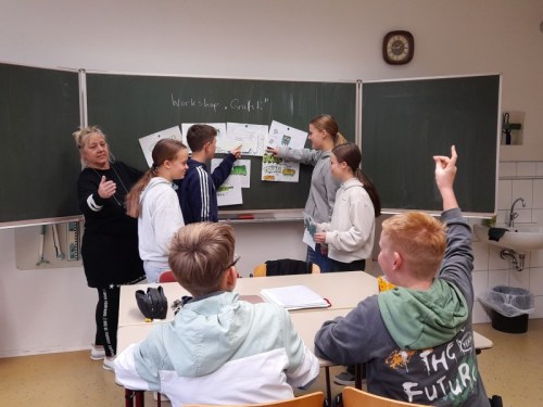 Zwischendurch wurden von der Presse Fotos gemacht und die Schüler und Herr Roth befragt. Viele haben zusammen gearbeitet und den Hintergrund aufgesprüht. Herr Roth erklärte uns, wie man Farbverläufe macht. Danach wurde alles ausgemalt. Der Schriftzug wurde dunkelgrün mit hellen Verläufen. Das Luftschiff wurde orange, was ein schöner Kontrast zu dem Anderen war. Zum Schluss wurde noch die Skyline mit typischen Merkmalen von Grüna gesprüht. Es war toll, mal so etwas zu machen. Auch wenn nicht alles perfekt aussieht, denken wir, dass es für das erste Mal gut geworden ist.