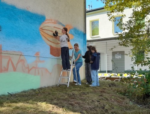 Zwischendurch wurden von der Presse Fotos gemacht und die Schüler und Herr Roth befragt. Viele haben zusammen gearbeitet und den Hintergrund aufgesprüht. Herr Roth erklärte uns, wie man Farbverläufe macht. Danach wurde alles ausgemalt. Der Schriftzug wurde dunkelgrün mit hellen Verläufen. Das Luftschiff wurde orange, was ein schöner Kontrast zu dem Anderen war. Zum Schluss wurde noch die Skyline mit typischen Merkmalen von Grüna gesprüht. Es war toll, mal so etwas zu machen. Auch wenn nicht alles perfekt aussieht, denken wir, dass es für das erste Mal gut geworden ist.