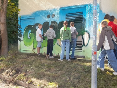 Ja das Leben ist bunt – so wie der Herbst es war und ist. Denn zum wiederholten Male durfte mit Genehmigung „gesprüht“ werden. Kein Raumduft, sondern Farben des Lebens. Motto der Aktion war „ Workshop Graffiti“. Und die Kandidaten dazu und Verfasser der Aneinanderreihung der wohl sortierten Buchstaben folgen jetzt namentlich aufgelistet: Applaus für Sina, Cora, Suheda, Levi, Leonard, Matti, Julien und Maxim!