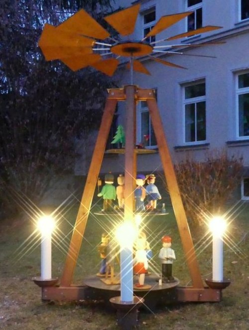 Das Pyramidengestell bleibt das ganze Jahr stehen, Auf- und Abbau der Figuren und der Beleuchtung erledigen Mitglieder des Heimatvereins. Wind und Wetter setzen dem Gestell und den Flügeln zu, so dass Renovierungen erforderlich werden, die stemmt der Heimatverein, so einen Neuanstrich in diesem Jahr. Und neue „Kerzen“-Halter kamen hinzu, im 3D-Druck wurden wiederum von der Firma BMF gefertigt.