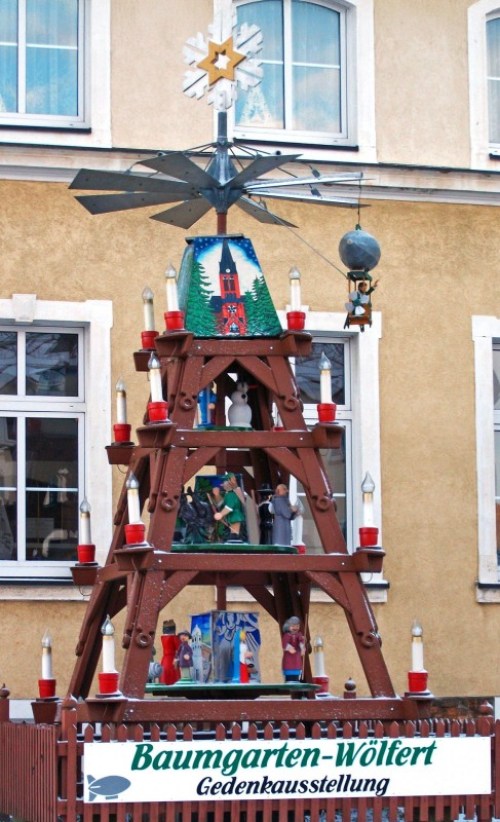 Unser Standort Grüna im Westen von Chemnitz ist für seine 3 großen Ortspyramiden bekannt, wovon eine ganzjährig vor dem Rathaus steht. Doch nur in der Weihnachtszeit wird die dreistufige Pyramide mit leuchtenden Kerzen und Figuren bestückt. Die untere Etage zeigt Figuren der biblischen Christgeburt, in der Mitte befinden sich Figuren ortstypischer Berufe und ganz oben sind Wintersportler und ein Schneemann zu sehen. Am Flügelrad umkreist ein Luftschiff mit dem einst in Grüna tätigen Luftschiffpionier Ernst Georg Baumgarten die Pyramide.