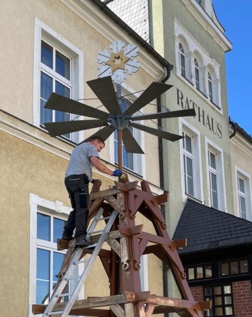 Das Pyramidengestell bleibt das ganze Jahr stehen, Auf- und Abbau der Figuren und der Beleuchtung erledigen Mitglieder des Heimatvereins. Wind und Wetter setzen dem Gestell und den Flügeln zu, so dass Renovierungen erforderlich werden, die stemmt der Heimatverein, so einen Neuanstrich in diesem Jahr. Und neue „Kerzen“-Halter kamen hinzu, im 3D-Druck wurden wiederum von der Firma BMF gefertigt.