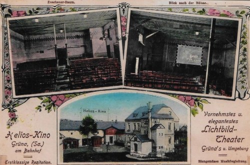 In dem ersten Beitrag über die Einführung der Kinematographie in Grüna wurde berichtet, dass gegen Ende des 1. Weltkrieges 1918 die ersten Filme in dem sogenannten Helios-Kino an der Eisenbahnhaltestelle im unteren Ortsteil Grüna von Gustav Weitmüller vorgeführt wurden. Es waren damals noch Stummfilme, die meist aus einem Drama oder Lustspiel sowie einem Beiprogramm bestanden, zu denen Musik gespielt und rezitiert wurde. Die Beiprogramme bestanden aus einer Reihe kurzer Filme und waren meist ausländischen Ursprungs. Unter ihnen waren auch Filme mit belehrenden und bildenden Inhaltes.