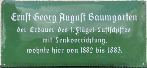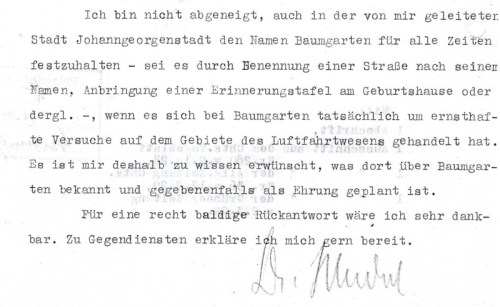 Der Grünaer Bürgermeister musste eingestehen, dass über Baumgartens Luftschiff-Versuche „amtliche Unterlagen im hiesigen Gemeindearchiv nicht vorhanden“ sind. Aber man habe ja schon eine Straße nach ihm benannt, und Walther konnte drei ausführliche Zeitungsartikel über das damals bekannte Leben und Werk des Fliegenden Oberförsters beifügen.