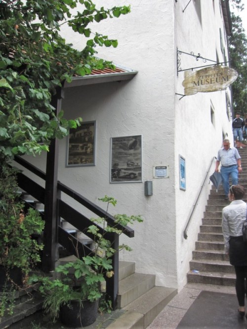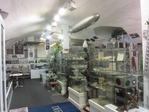 Mein Herz schlug höher, als ich in dem alten, beeindruckenden Gewölbe unser Schild entdeckte, am Fußboden hinter einem Hocker (im Foto gut zu erkennen). Zwischen all den ungezählten Zeppelin-Originalteilen und -Dokumenten schien es aber nicht so recht dazuzugehören. Und ich konnte diesen Ort nicht verlassen, ohne mit dem Besitzer gesprochen zu haben. Eine gute Stunde saßen wir im benachbarten Café.