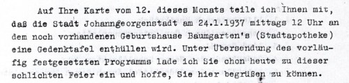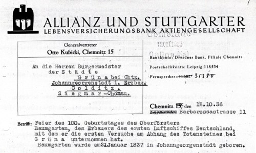 Überrascht war Johanngeorgenstadt, denn in Baumgartens Geburtsort war über den Luftschiff-Erfinder bisher nichts bekannt. Bürgermeister Dr. Wedel schrieb nach Grüna: