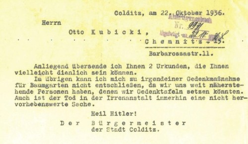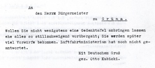 Grüna verhielt sich ausweichend. Bürgermeister Walther wollte zunächst den Gemeinderat fragen, der vertagte das Thema auf die nächste Sitzung. Danach hieß es, man habe für ein Denkmal kein Geld, und auch Privatspenden seien wegen der Sammlungen für das Winterhilfswerk unwahrscheinlich. Für eine einfache Tafel aber bestünde „keine Neigung“. Kubicki hatte die Kosten für ein Denkmal mit 350 Mark und für eine Tafel mit 125 bis 250 Mark veranschlagt und mahnte noch einmal: