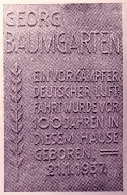 Baumgartens 100. Geburtstag am 21. Januar 1937 war nun Anlaß für den Verein, sich um eine gebührende Ehrung zu bemühen. Engagierte Unterstützung erhielt er von Otto Kubicki aus Chemnitz, welcher über sein Hobby „Zeppelin-Luftpost“ auf Baumgarten gestoßen und von dessen Persönlichkeit und Erfinderleistung fasziniert war. Er schrieb an die Bürgermeister von Johanngeorgenstadt (Geburtsort), Grüna (Wirkungsstätte), Siegmar (letzter Wohnort) und Colditz (Sterbeort), man möge sich doch dafür einsetzen, dem Luftschifferfinder ein Denkmal oder wenigstens eine Gedenktafel zu setzen.