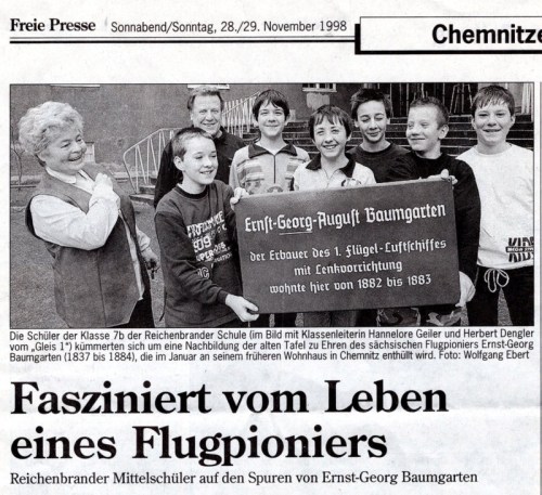 1998 wurde das Thema neu belebt, als eine 6. Schulklasse aus Reichenbrand nach einer Wanderung auf dem Baumgarten-Rundweg mit Nachforschungen über den Luftschiffpionier begann, auch in der Grünaer Ausstellung bei Karl-Heinz Neubauer. In Zusammenarbeit mit dem Soziokulturellen Zentrum „Gleis 1“ in Siegmar entstand der Plan, die gestohlene Tafel durch eine originalgetreue Kopie zu ersetzen. Diese kostete 400 DM (aus Mitteln des soziokulturellen Jugendfonds der Stadt) und wurde an Baumgartens 162. Geburtstag feierlich angebracht.