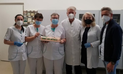 Und was geht, wissen selbst viele nicht, die ganz nah an der Quelle sitzen, denn morgen ist alles anders als gestern und heute ist das schon fast wieder vorbei… Vorbei ist aber nicht die Illusion, ein Stück Normalität zurück zu holen, und so treffen sich regelmäßig Schaustellerikone Herr Illgen, die „Einsiedler Brauerei“, Unterstützer wie Getränke-Pfeifer und Menschen aus der Kulturbranche um auszuloten, ob es doch wieder mal ein „heißer“ Sommer wird in unserem Bad… Ein Kultursommer vielleicht? In diesem Falle baue ich auf die schnelle Verbreitung von Informationsflut durch unseren Ortsbuschfunk, denn die Karten stehen nicht schlecht für eine Bademantelparty zur Kirmes…. Aber, Gesundheit geht vor und so ging ich mit meinem Stellvertreter und dem Apotheker meines Vertrauens, Herrn Aurich, zur Gesundheit pur, also in unser Ärztehaus auf der Dorfstraße. Nicht nur, dass die Zahnarztpraxis Mann dort schon seit 30 Jahren in zweiter Generation praktiziert, nein im Erdgeschoss gab es ein Jubiläum der besonderen Art – 70 Jahre Dr. Ritter – also nicht vom Alter her, sondern 40 Jahre praktiziert Dr. Uwe Ritter nun schon für uns Grünaer und die Umgebung und 30 Jahre gemeinsam im Ärztehaus mit seiner liebenswerten Gattin. Hätte Dr. Marcus Mann gesehen, mit welcher süßen Versuchung (Danke an den Teigdesigner Andre Bösewetter) wir den „Ritter“ schlag vollziehen, hätte er vermutlich sofort den Bohrer angeworfen und Mischung gemacht. Um es in die wichtigsten Worte zu packen, solange man noch Zähne sein eigen nennen darf…