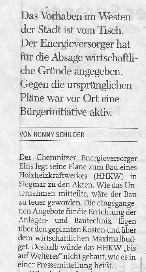 Die Gründung bzw. das erste Zusammensetzen hierfür fand natürlich wo statt? Na klar, im schönen G…(ich meinte nicht Gemnitz). Als kleiner Abschluss zu dieser Geschichte – die Antwort zu einer gestellten Frage zum Antragsverfahren „Errichtung eines Holzkraftwerkes in Chemnitz Siegmar“ durch die BI an die Landesdirektion und dem Artikel und Bericht in der Freien Presse lautete auszugsweise wie folgt: