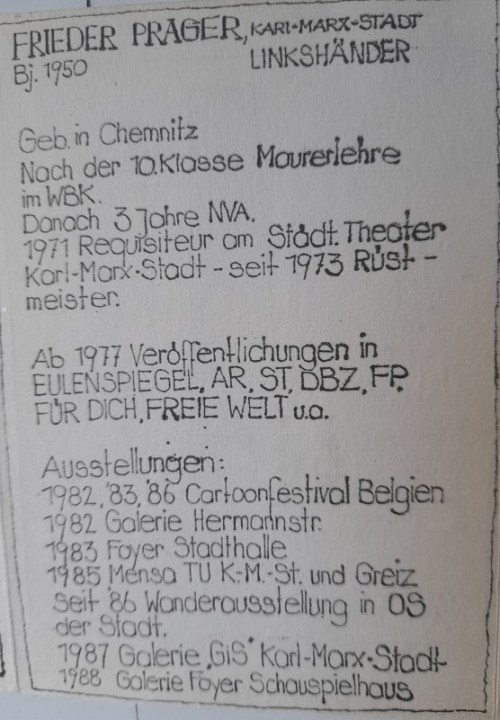 Frieder Prager kennen wir mit seiner Frau Kerstin Nipold eigentlich vom KiG. Jahrelang brachten sie Stars und Sternchen auf die Bühne, kümmerten sich um Nachwuchstalente und diverse Veranstaltungen, bis Fritze dann seinen Plan umsetze und sich seinen Traum eines kleinen und feinen Theaters, dem „Fritz-Theater“, erfüllte. Auch der GFC durfte dort eine Saison verbringen, da das KiG nicht zur Verfügung stand. Aber in „Fritze“ schlummerten früher ganz andere Talente, welche ich in meiner Sammlung in Ehren halte. Seinen Lebenslauf, wie sollte es anders sein, hat er selbst „aufgezeichnet“.