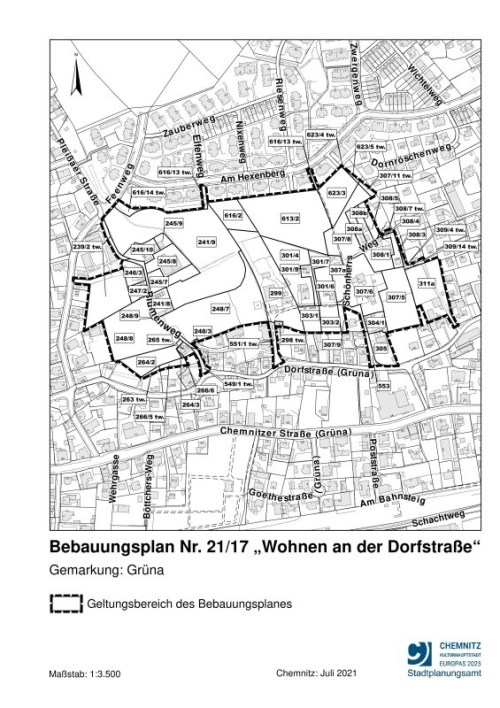 Und zurück zum Hexenberg bzw. in die Nähe davon, denn es soll die Möglichkeit gegeben werden, seinen Traum von den eigenen 4 Wänden zu verwirklichen. Dazu sollten sich Anwohner den 14. Oktober von 15.00 Uhr – 17.00 Uhr im Grünaer Ratssaal vormerken. Herr Nicolas Hamman, seines Zeichens Abteilungsleiter Stadtplanung, wird dort gern Rede und Antwort stehen und Auskünfte über das angedachte Vorhaben erteilen. In der Gemarkung Grüna im Bereich zwischen der Dorfstraße und am Hexenberg soll der Bebauungsplan Nr. 21/17 „Wohnen an der Dorfstraße“ aufgestellt werden.