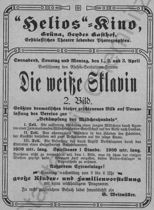 Zu dieser Zeit wohnte in Hohenstein-Ernstthal auf der Dresdener Straße 24 der Kartonagenfabrikant Gustav Weitmüller, der die Absicht hatte, sich mit dem Film- und Kinobetrieb zu beschäftigen. Als er von dem Filmvorführgerät erfuhr, kaufte er es noch im gleichen Jahr und begann intensiv mit den Filmvorbereitungen [3]. In Weitmüllers Aufzeichnungen steht, dass er „beabsichtigte, bald nach Grüna zu ziehen, um dort ein größeres Kino zu errichten, das allen Anforderungen der Neuzeit gerecht wird“. Er nutzte wie bereits vorher Kämpfe zunächst das Gasthaus Heyde für seine Vorführungen und ließ dort 2 größere Plakate aufstellen [4]. Zu Weihnachten 1910 fand schon die Eröffnungsvorstellung statt.