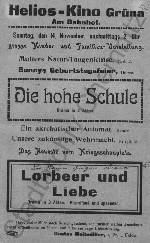 Nach Ausbruch des Krieges verschwanden vielfach die Beiprogramme aus den Lichtspielhäusern, die meist aus dem Ausland importiert wurden [5]. Anstelle dieser Filme führten die Kinobesitzern oft ein zweites Lustspiel oder Drama vor. Um dies zu verhindern, wurde Mitte 1917 eine neue Verordnung in Kraft gesetzt, die die Kinobesitzer zwingen sollte, ein von der deutschen Lichtbildgesellschaft E.V., Berlin wöchentlich erarbeitetes Beiprogramm zu zeigen. Dieses enthielt Informationen über Deutschlands kulturelle und industrielle Errungenschaften, sein Wirtschafts- und Verkehrswesen sowie landschaftliche Schönheiten. Damit sollte auch erreicht werden, dass die Lichtspielhäuser nicht einseitig der Vergnügungssucht dienen, sondern in ihren Programmen auch Informationen zur Bildung, Belehrung, staatsbürgerlichen Erziehung u.a. enthalten [6]. Die Veranstaltungsprogramme wurden in den Kriegsjahren zeitweise durch Filmstücke über die aktuellen Kriegsereignisse ergänzt. Sie unterlagen der Zensur des Sächsischen Ministeriums des Inneren bzw. des späteren Kriegsministeriums [8].