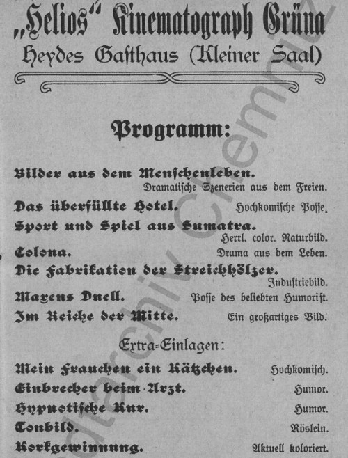 In dem ersten Beitrag über die Einführung der Kinematographie in Grüna wurde berichtet, dass gegen Ende des 1. Weltkrieges 1918 die ersten Filme in dem sogenannten Helios-Kino an der Eisenbahnhaltestelle im unteren Ortsteil Grüna von Gustav Weitmüller vorgeführt wurden. Es waren damals noch Stummfilme, die meist aus einem Drama oder Lustspiel sowie einem Beiprogramm bestanden, zu denen Musik gespielt und rezitiert wurde. Die Beiprogramme bestanden aus einer Reihe kurzer Filme und waren meist ausländischen Ursprungs. Unter ihnen waren auch Filme mit belehrenden und bildenden Inhaltes.
