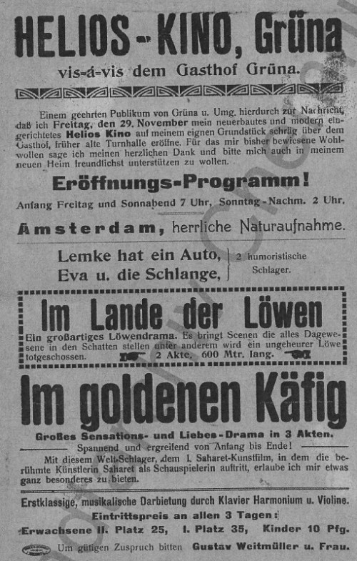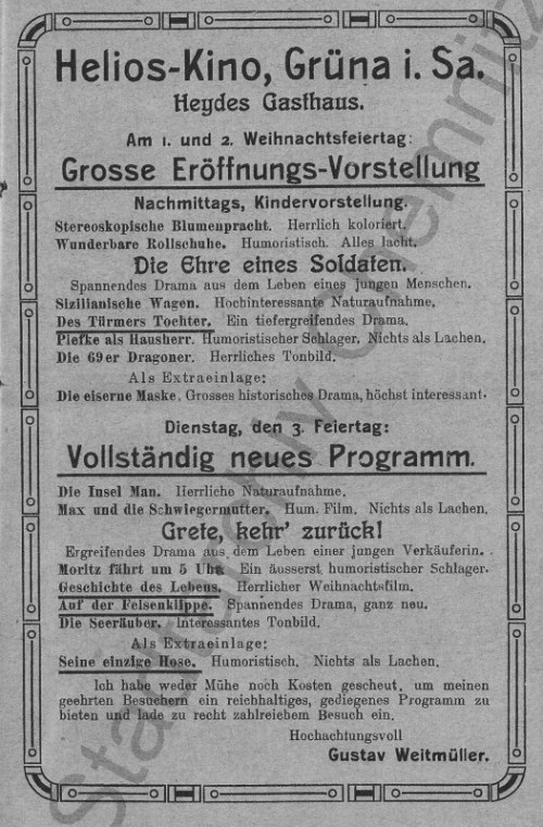 Zu dieser Zeit wohnte in Hohenstein-Ernstthal auf der Dresdener Straße 24 der Kartonagenfabrikant Gustav Weitmüller, der die Absicht hatte, sich mit dem Film- und Kinobetrieb zu beschäftigen. Als er von dem Filmvorführgerät erfuhr, kaufte er es noch im gleichen Jahr und begann intensiv mit den Filmvorbereitungen [3]. In Weitmüllers Aufzeichnungen steht, dass er „beabsichtigte, bald nach Grüna zu ziehen, um dort ein größeres Kino zu errichten, das allen Anforderungen der Neuzeit gerecht wird“. Er nutzte wie bereits vorher Kämpfe zunächst das Gasthaus Heyde für seine Vorführungen und ließ dort 2 größere Plakate aufstellen [4]. Zu Weihnachten 1910 fand schon die Eröffnungsvorstellung statt.