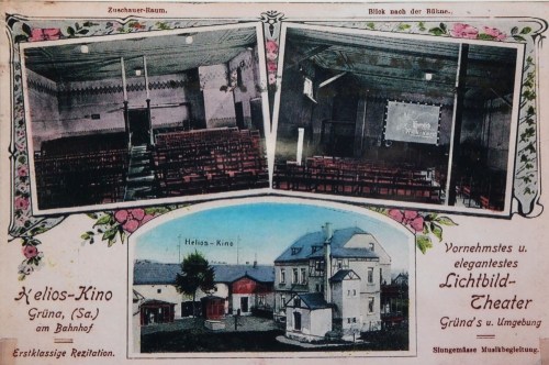 Die ersten Filme wurden in der Gemeinde Grüna 1918 vermutlich gegen Ende des 1. Weltkrieges gezeigt. Die Vorführungen fanden im sogenannten Helios-Kino an der unteren Eisenbahnhaltestelle (damals mit Bahnhof bezeichnet) in Grüna statt.