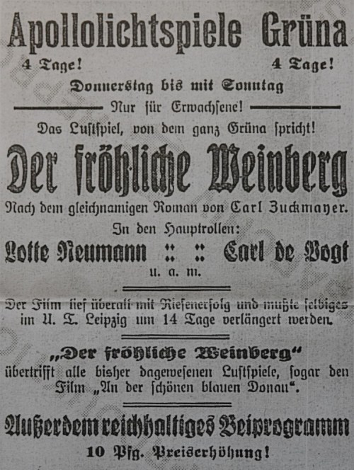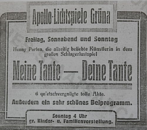 Filmankündigung aus den Grünaer Nachrichten vom 12.4.1928