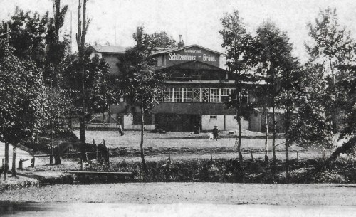 Das „Schützenhaus“ an der Mittelbacher Str. 16,in welchem bis zum 2. Weltkrieg die Grünaer Scheibenschützengesellschaft ihr Domizil hatte, wurde in den Jahren nach 2000 abgerissen. (Im Vordergrund ist noch der Wiesenteich zu sehen, der ab 1926 zum Sommerbad Grüna umgestaltet wurde.)