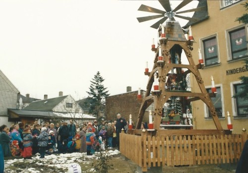 Auch in den folgenden Jahren 1995 und 1996 konnte die Grünaer Gemeinde ihre Kindertagesstätte wie bisher zur Zufriedenheit der Eltern und Kinder weiterführen. Zur Freude der Kinder und Erwachsenen wurde zur Vorweihnachtszeit 1995 vor dem Kindergarten an der Chemnitzer Str. 95 eine größere Pyramide aufgestellt. Sie entstand in Gemeinschaftsarbeit zwischen dem Schnitzverein Grüna und Grünaer Handwerkern.