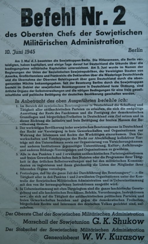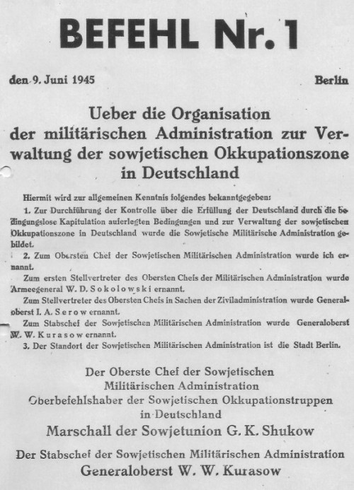 Zur Kontrolle und Verwaltung der sowjetisch besetzten Gebiete war mit dem Befehl Nr.1 am 9. Juni 1945 die SMAD gebildet und eingesetzt worden. Oberster Befehlshaber für das gesamte Okkupationsgebiet in Deutschland war Marschall Shukow. Die SMAD übte die uneingeschränkte Regierungsgewalt aus, verbunden mit der Aufrechterhaltung der öffentlichen Ordnung und Sicherheit sowie der Regelung lebenswichtiger Aufgaben. Die Machtübernahme wurde der deutschen Bevölkerung mit diesem ersten Befehl bekannt gegeben.