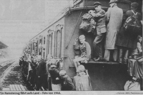 Nach der Besetzung unseres Landes durch die sowjetischen Truppen drohte die Ernährungslage sich weiter zu verschlechtern. Die meisten Menschen lebten weiterhin nur noch von der Substanz und ihren wenigen Vorräten. Sie versuchten zu überleben und waren gezwungen, sich selbst zu helfen, ihre Existenz und Lebensgrundlage zu sichern. Es herrschte ein wilder Handel von Nahrungsgütern im Austausch mit anderen Produkten. Die Menschen fuhren nach außerhalb in Gegenden mit mehr Landwirtschaft, um sich Lebensmittel im Tausch mit anderen Gütern zu verschaffen. Sie gingen „Hamstern“. Die Züge waren meist übervoll mit Menschen besetzt.