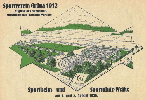 In Grüna hatte das Vereinsleben, besonders im Sport, stets einen hohen Stellenwert. Die Grünaer Sportvereine schlossen sich am 12. Oktober 1912 zum Sportverein SV Grüna 1912 e.V. zusammen. (So, wie auf dem Bild dargestellt, sollte ein Sportplatz des SV Grüna an der damaligen Bahnhofstraße, heute August-Bebel-Straße, einmal aussehen, wurde aber letztlich nicht umgesetzt.)