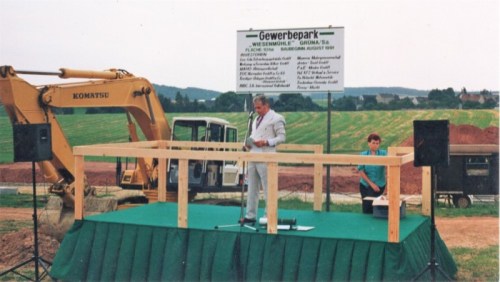 Seine Arbeit ist geprägt durch schnelles Handeln und Sachkenntnis, Durchsetzungsvermögen bei Ämtern und Behörden, aber auch Übernahme von Selbstverantwortung. Zielstrebig, mit guten Gedanken und ohne Schonung von Person und Gesundheit gehen der Bürgermeister und seine engsten Mitstreiter die Aufgaben an. Dabei sind zwölf Stunden Arbeitszeit normal, und 15 oder 18 Stunden keine Seltenheit. Für Grüna gilt: 1. Arbeit schaffen (Gewerbegebiet), 2. Wohnungen bauen (Hexenberg), 3. Kultur entwickeln (Folklorehof). Dazu Sanierung von Straßen und Versorgungsleitungen, Neubau des Abwassersystems, und, und, und ... Dabei aber nicht die Finanzen aus dem Auge verlieren! Die Grundsteinlegung für das Gewerbegebiet Wiesenmühle (das erste im Landkreis!) erfolgt am 24.8.91 (Foto) ohne Bebauungsplan – eigentlich ein Ding der Unmöglichkeit. Doch mit dieser Arbeitsweise ist Grüna vielen anderen Gemeinden ein Stück voraus, vor allem der Chemnitzer Bürokratie mit ihrem Parteienstreit.