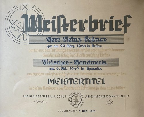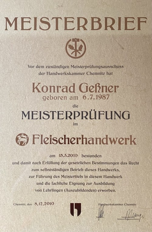 1955 übernahmen Erika und Heinz Geßner das Geschäft der Eltern Lieberwirth. Sohn Rolf (geb. 1953, verheiratet mit Gabi Sonntag) übernahm dann 1985 vom Vater, seit 2019 ist Konrad, der Sohn von Gabi und Rolf, Inhaber der Fleischerei. In 14. Generation ununterbrochenem Fleischerhandwerk in einer Familie! Sachsenrekord? Bestimmt! Vielleicht auch deutscher, europäischer oder Weltrekord …. Und mit dem 2020 geborenen Friedrich, Sohn der jetzigen Inhaber Corinna und Konrad Geßner, steht vielleicht schon die 15. Generation in den Startlöchern.