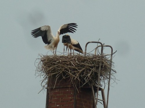 Anfang April 2019 kam Papa Storch zum Horst in Grüna zurück, um ihn für dieses Jahr wieder zu besetzen und weiter daran zu bauen. Am 16.4. folgte eine Störchin. Sie war beringt, was darauf schließen lässt, dass es sich dabei nicht um denselben Vogel handelt, der schon 2017 einmal hier war, denn damals trug „sie“ keinen Ring. Im Gegensatz zur landläufigen Meinung von lebenslanger Storchenehe sind Störche nämlich nicht unbedingt partner-, sehr wohl aber horsttreu, zumindest, wenn sie sich einmal gefestigt haben. Was bei den ersten Bruten noch nicht unbedingt der Fall sein muss. Horsttreu bedeutet nichts anderes, als dass sich beide Partner in der Regel im Frühjahr wieder zu demselben Nest aufmachen, welches sie schon im Vorjahr bewohnt haben. Wo sich die beiden dann mitunter wieder treffen und das gleiche Paar wieder gemeinsam brütet. Manchmal ist aber auch ein(e) andere(r) schneller und dann gibt es halt ein neues Pärchen. Es geht den Störchen wie den ..…