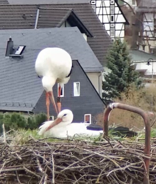 Das lange Warten auf unsere Störche hatte am 16. März ein Ende. An diesem Tag wurde die Brutstörchin der letzten Jahre zum ersten Mal am Horst gesichtet. Am 22. März traf ein zweiter Storch ein. Nach einiger Zeit des Beäugens aus der Ferne ließ sich auch dieser auf dem Horst nieder. Dem bald einsetzenden Paarungsverhalten nach handelte es sich um ein Männchen. Einige Tage lang wurde ein liebevoller Umgang miteinander gepflegt.
